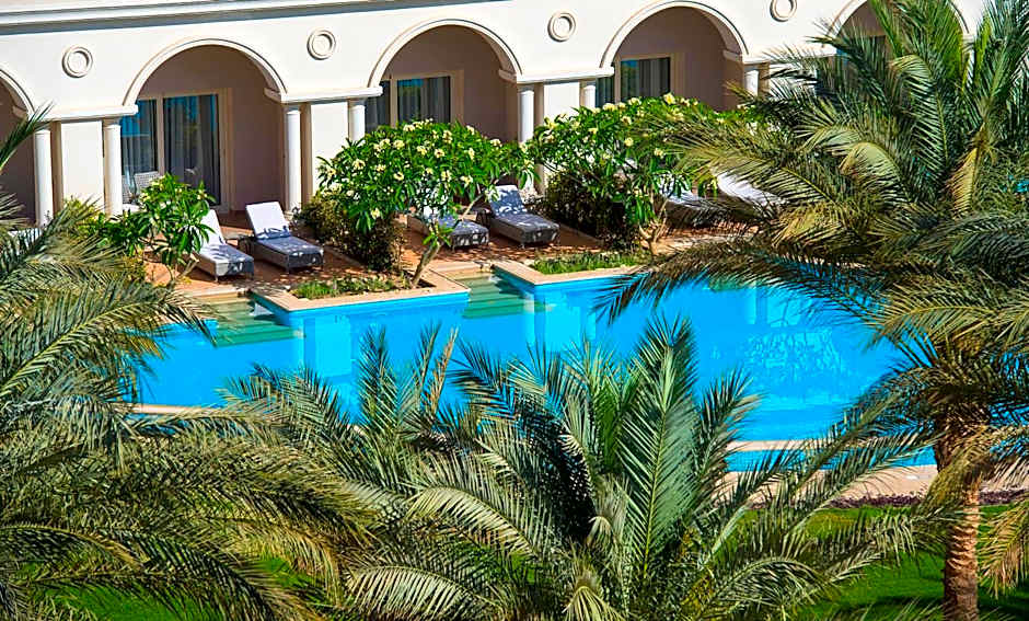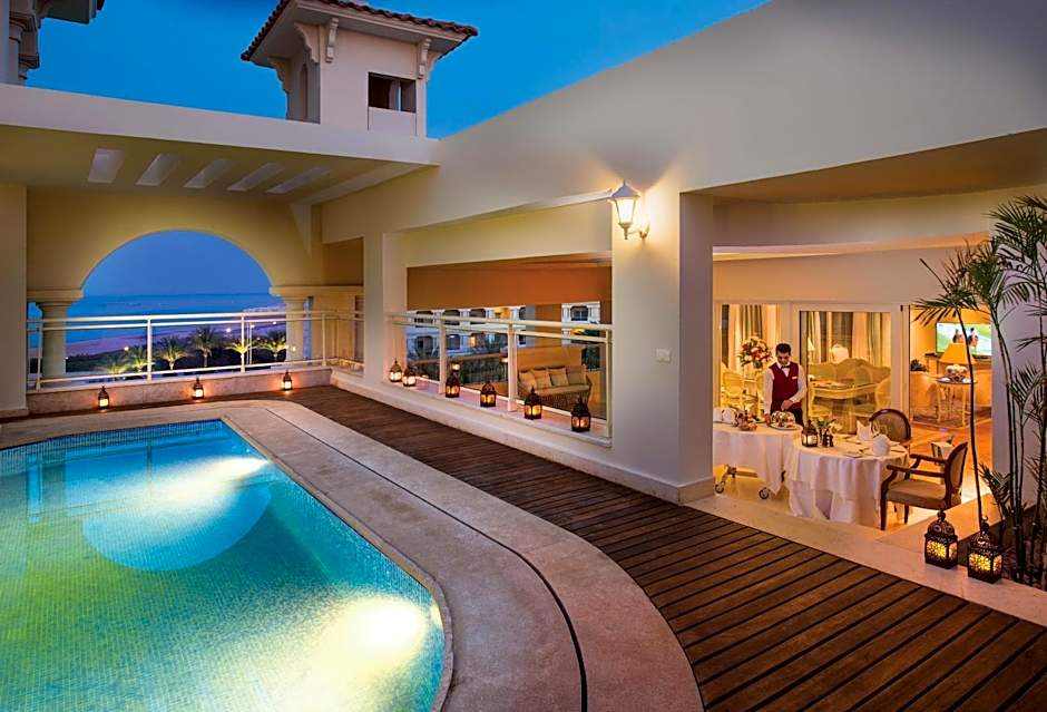 Featuring a bedroom with opulent fabrics and bespoke furniture along with a large deep-soaking bathtub (Jacuzzi), vanity area with double basin and separate shower, the suite becomes a sensory retreat. This luxurious, unique suite reflects an elegant, classic sense with a breathtaking view over Sahl Hashish Bay, a magnificent view of the golden sandy beach, the clear turquoise sea, the most famous reef walls with the coral slopes and the colorful water leaping your feet and triggering your emotions, turned it a perfect choice for those who are searching for luxury. The availability of your personal butler 24 hours. Private swimming pool overlooking the majestic red sea with its private bathroom, dining table for 4 people with complimentary breakfast in the Suite and unlimited visits our high quality awarded “A La Carte” gourmet restaurants for guests on Premium All Inclusive.